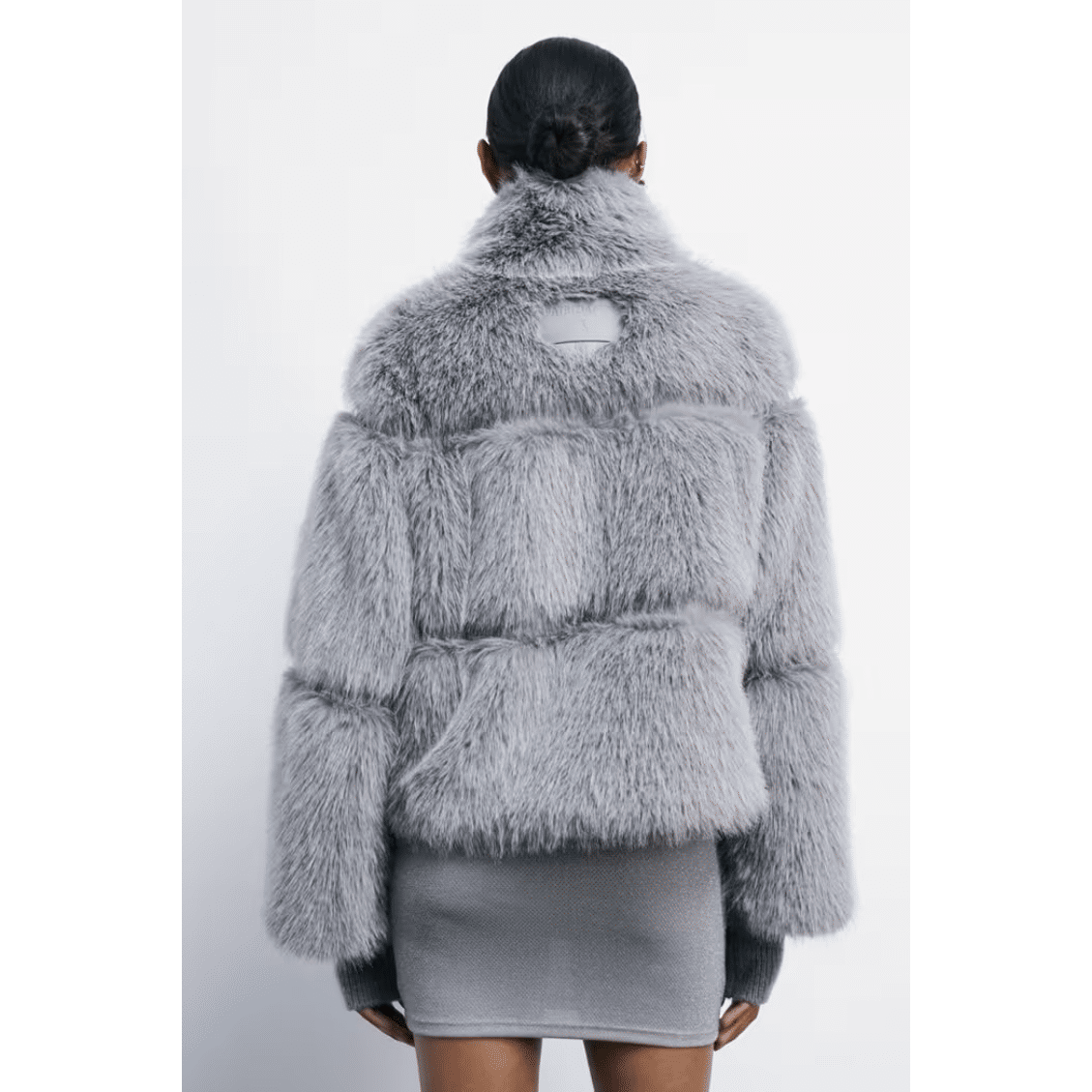 Dieser kurze flauschige Mantel zeichnet sich durch einen hohen Kragen aus, der für einen modernen und gemütlichen Look sorgt. Strickbündchen halten warm, während beschichtete Stoffeinsätze an Ärmeln und Knopfleiste für Struktur sorgen. Weich und voluminös, verleiht er Casual-Glam-Outfits Charakter – perfekt kombiniert mit weit geschnittenen Jeans und Stiefeletten mit Absatz.